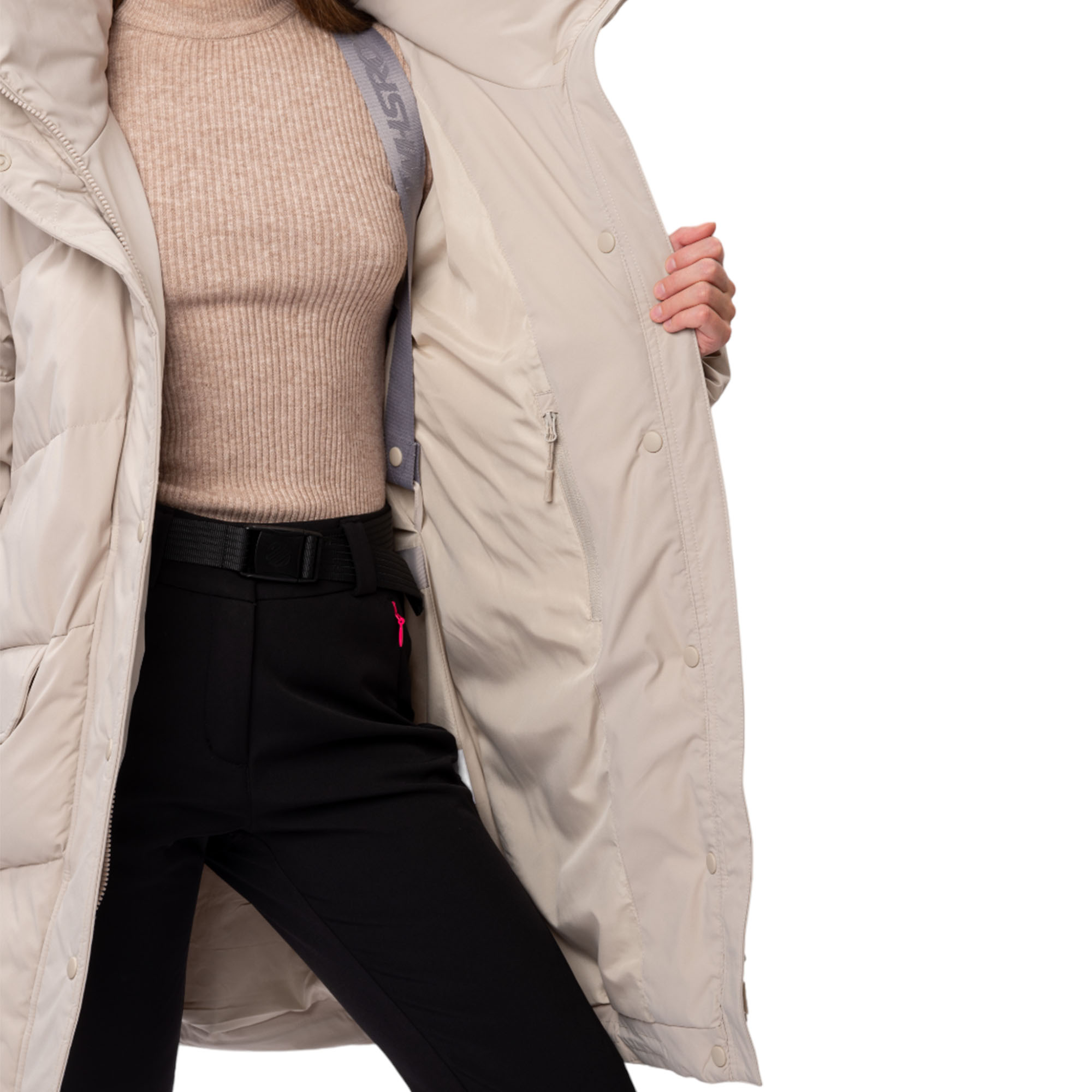 Сочетая в себе функциональность и стиль женская зимняя куртка WHSROMA станет идеальным выбором для любительниц активного отдыха и повседневных дел в холодное время года. Изготовленная из прочной курточной мембранной ткани на основе полиэстера, куртка обеспечивает высокий уровень комфорта и защиты. Водоотталкивающая и антибактериальная обработка материала гарантирует сохранность тепла и сухости в условиях мокрого снега и ледяного дождя. Дополнительную защиту от холода обеспечивает утеплитель DuPont ball cotton с плотностью 230 г/кв.м, который способен сохранять тепло при температурах до -30 °C. Дизайн куртки подчеркивает женственность и утонченность образа. Регулируемый несъемный капюшон, воротник-стойка и снегозащитная юбка эффективно защищают от проникающего ветра и снега. Боковые и нагрудный карманы на молнии позволяют безопасно хранить необходимые мелочи и гаджеты. Куртка WHSROMA – это оптимальное решение для тех, кто ценит сочетание практичности, комфорта и элегантности и идеально подходит для занятий сноубордингом, походов на свежем воздухе или просто для повседневного использования в зимний период.Особенности и характеристики: